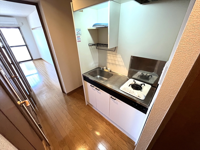 シンクの上に棚があり、無駄のない空間のキッチンスペース🍽